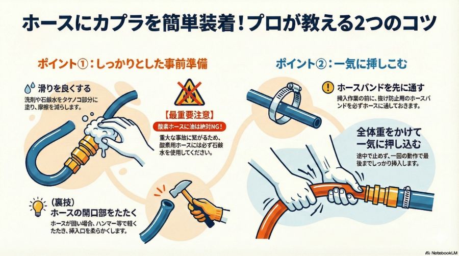 今回紹介した内容はエアーカプラだけではなく、両端タケノコになっているホースジョイントやアポロコック取り付けにも有効です。