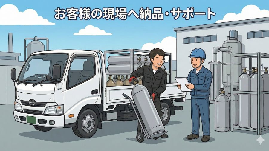 当社は、高圧ガスや溶接材料などを中心に取り扱う商社です。「商社」と聞くと難しく感じるかもしれませんが、役割はとてもシンプル。「地元企業のパートナーとして、必要なものを必要な時にお届けすること」です。